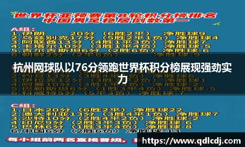 杭州网球队在最近的世界杯积分榜上以76分领跑,展现出强劲的实力和卓越的竞技水平。本文将从四个方面对这一成就进行详细阐述,包括球队的团队合作、技术战术、球员表现及未来展望。首先,团队合作是杭州网球队能够在激烈竞争中脱颖而出的关键因素之一;其次,独特且高效的技术战术为球队提供了坚实的基础;第三,球员个人...